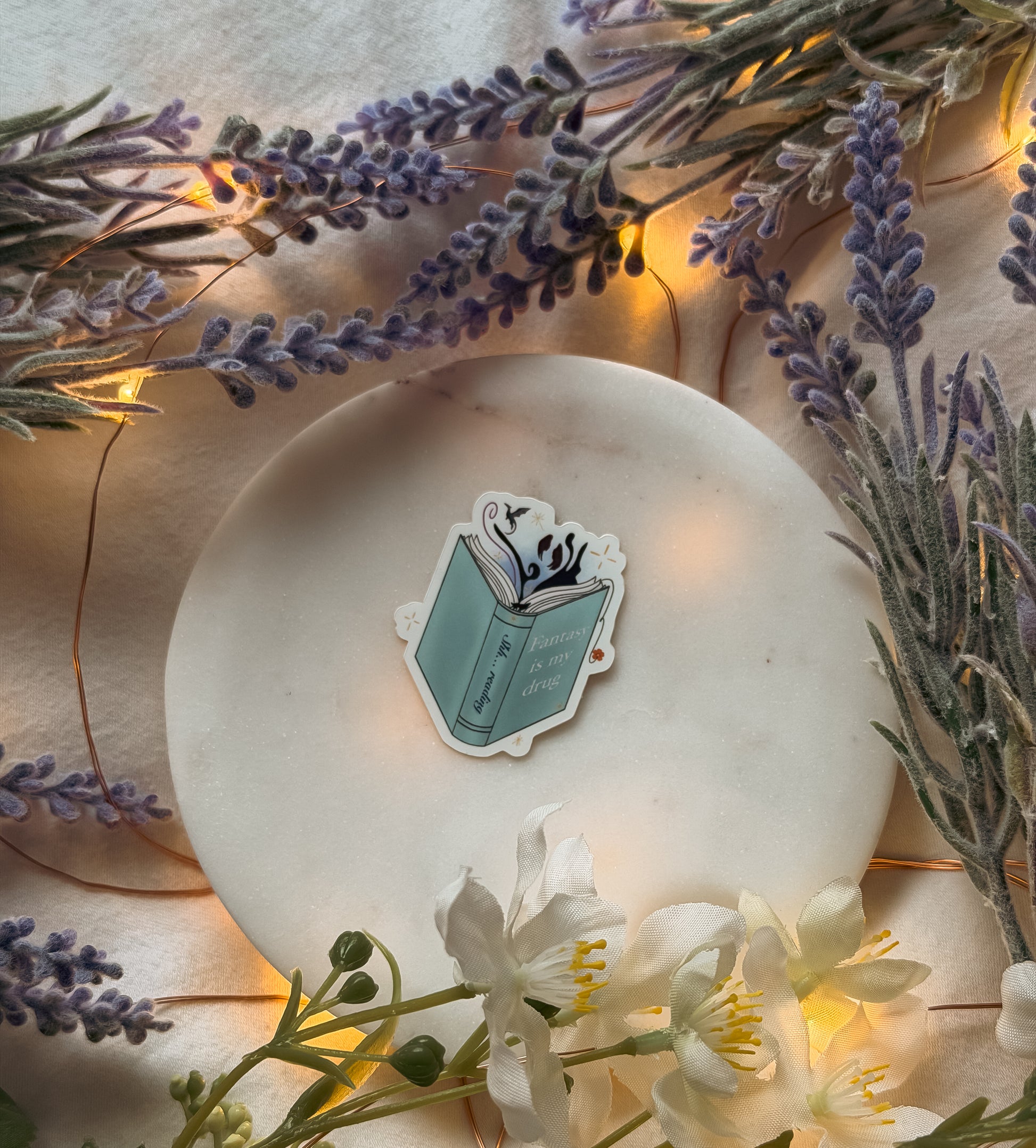 Show the world that you are into reading fantasy books with this sticker. This sticker design has a dragon, wolf, flowers, stars, wings and some dark shadows.